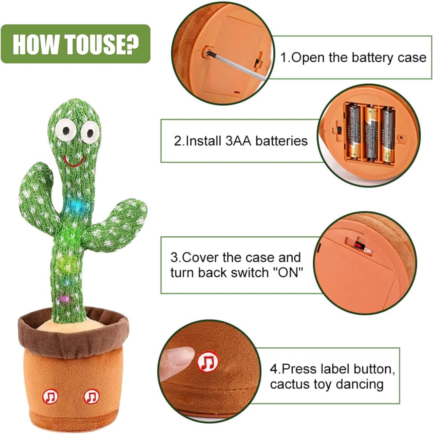 খেলতে খুব সহজ: বড়রা ক্যাকটাসের নিচে থাকা কভার খুলে ব্যাটারি বক্সে ৩টি AA ব্যাটারি দিন। তারপর সুইচটি "অন"-এ রাখুন। আপনার ছোট্ট শিশুর জন্য গোপন সুইচটি পাওয়া যাবে ফুল পটের নিচে—তাদের চমক দিতে এটিকে চাপতে বলুন।